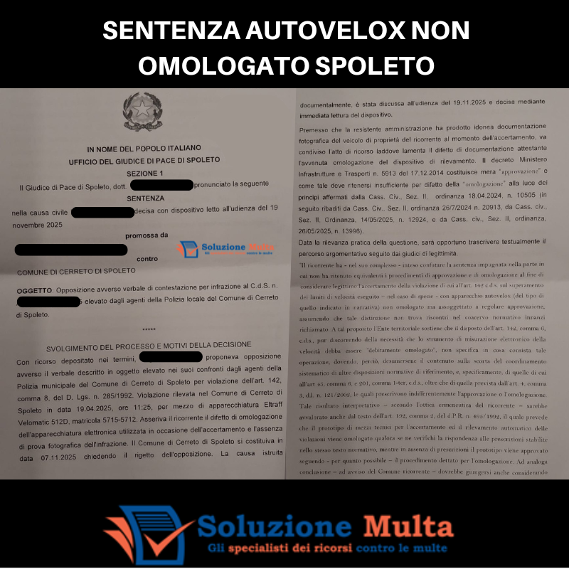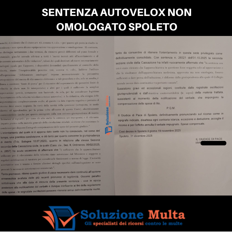 Con sentenza del 19 novembre 2025, il Giudice di Pace di Spoleto ha annullato una multa per eccesso di velocità, ritenendo illegittimo l’accertamento perché effettuato con autovelox non omologato.